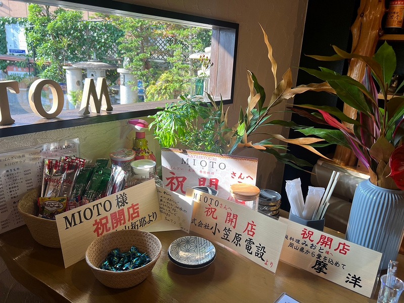 当店では、ところどころに草木やお花を店内に取り入れており、お客様に温もりを感じていただけるような空間になっております。自然なところにいくと、心が休まったり、日々の疲れを癒していただけるのと同じで、みおとも皆様にとって安心してくつろいでいただける空間になればと思いこのような温かな店内にさせて頂ております。一度お気軽にご来店ください。